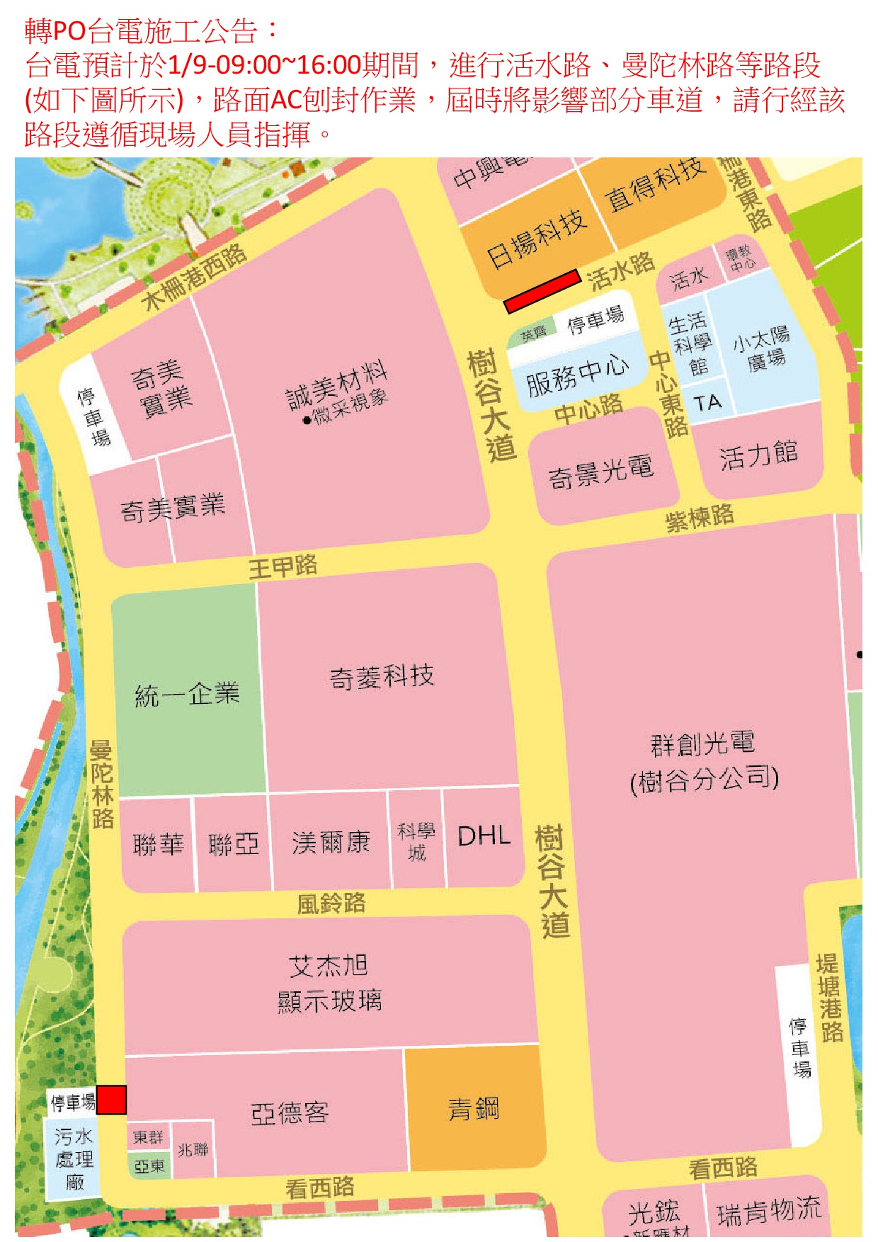 台電預計於1/9-09:00~16:00期間,進行活水路、曼陀林路等路段(如下圖所示),路面AC刨封作業,屆時將影響部分車道,請行經該路段遵循現場人員指揮。