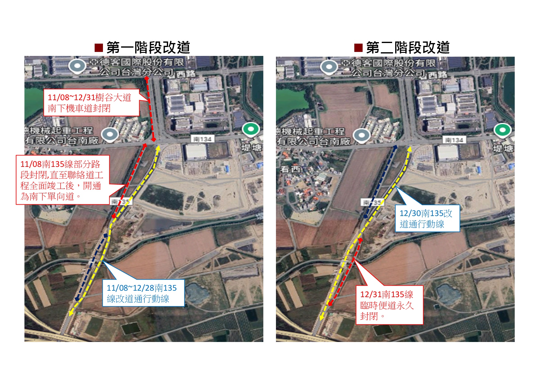 有關臺南都會區北外環銜接樹谷園區聯絡道工程,11/8起將封閉樹谷大道與看西路口南下機車道及南135線部分路段,進行道路改建工程;封閉時程及改道措施如附圖所示。