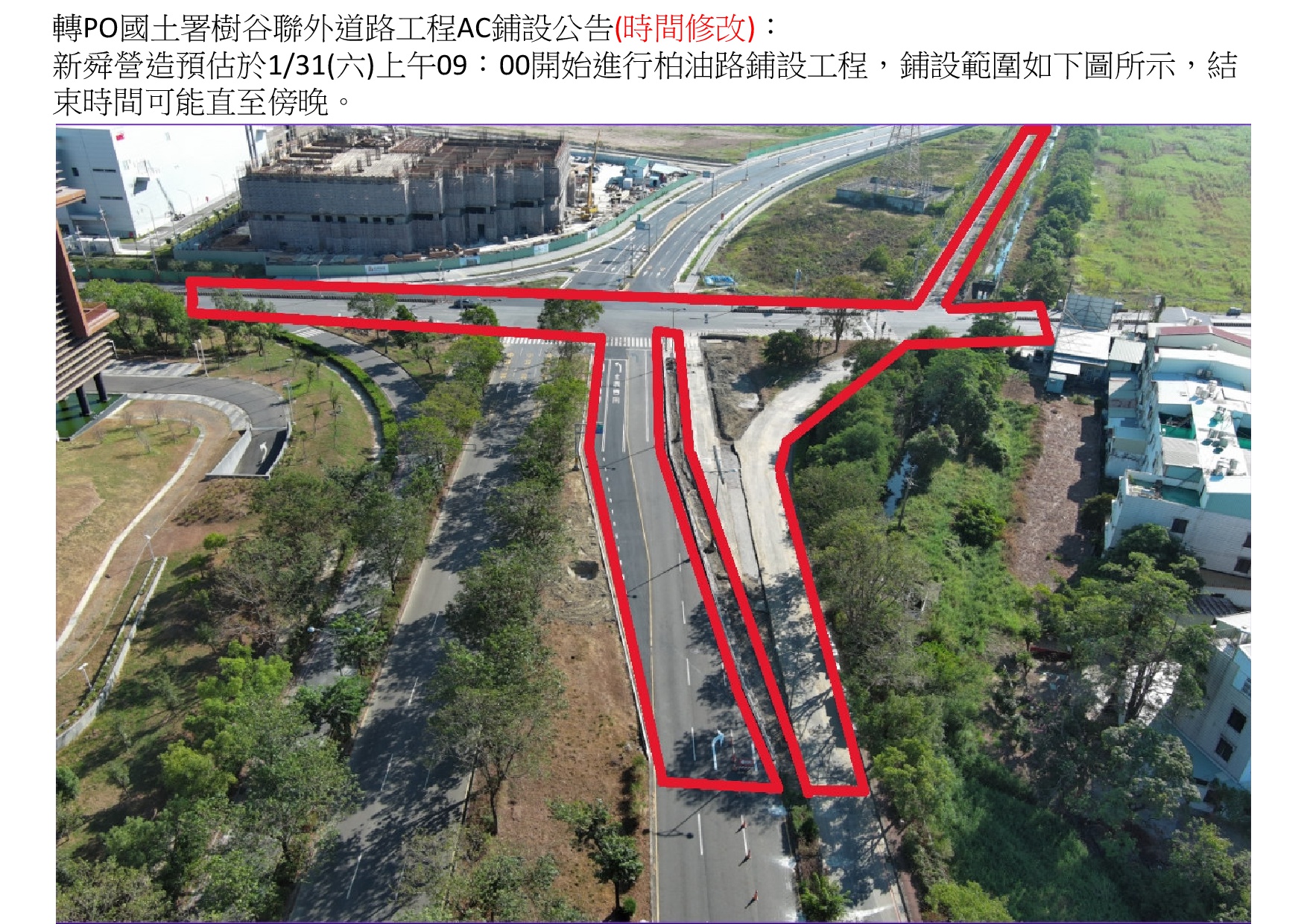 道路施工管制公告:1/31(六)09:00國土署樹谷聯外道路AC鋪設